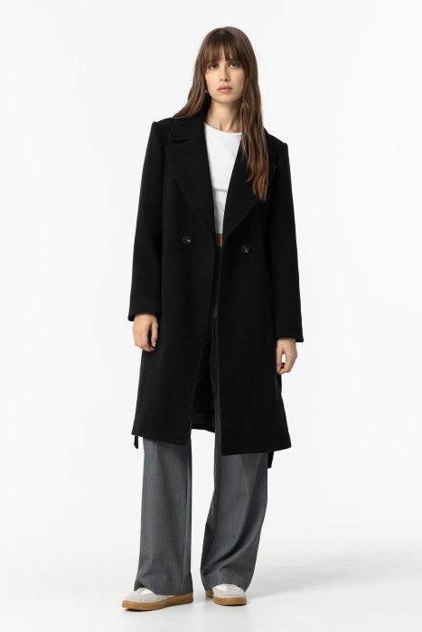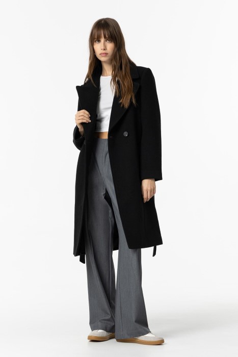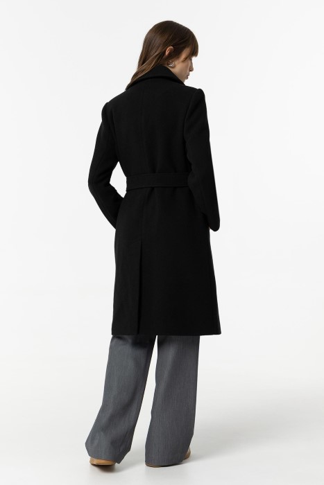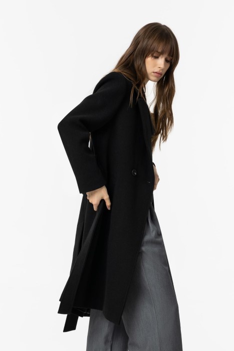 Wool coat. Lapel collar and long sleeves. Front pockets with piping. Belt fastening.