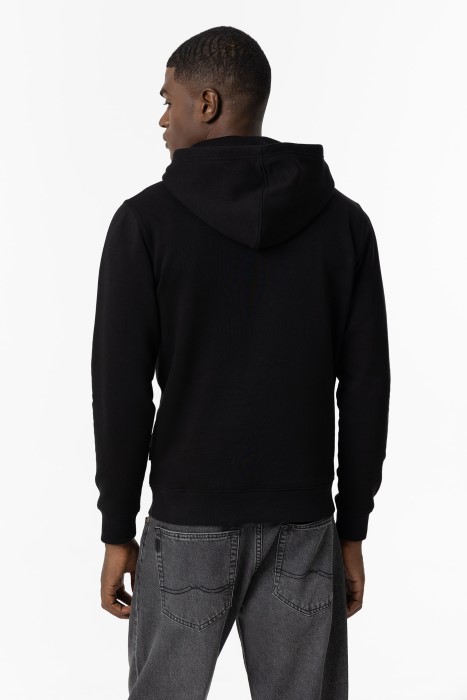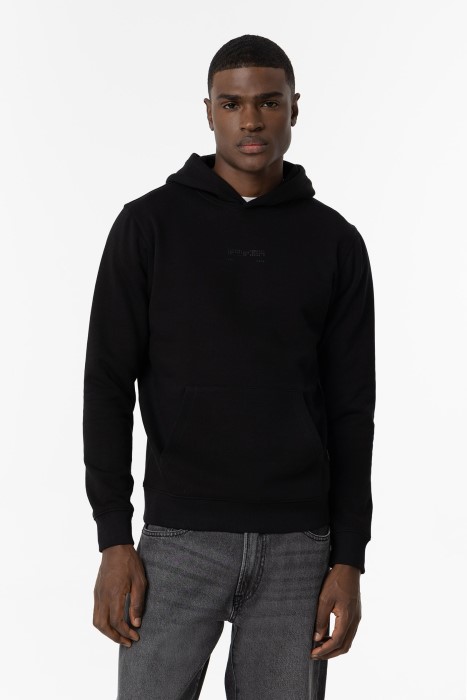 Hoodie with hood, round neck, and long sleeves with fleece. Front print. Ribbed ends. Kangaroo pocket.