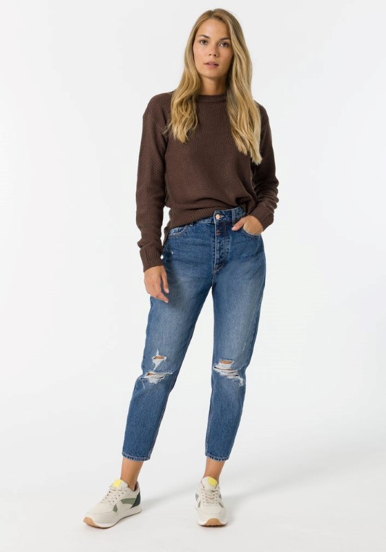 Ψηλόμεσο τζιν με πέντε τσέπες. Κλείσιμο μπροστά με φερμουάρ και μεταλλικό κουμπί
