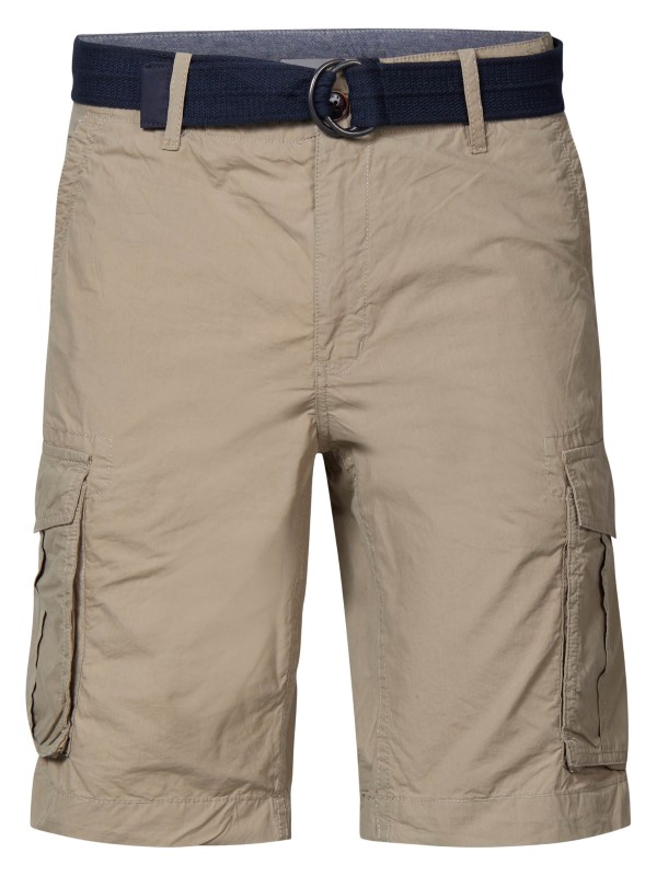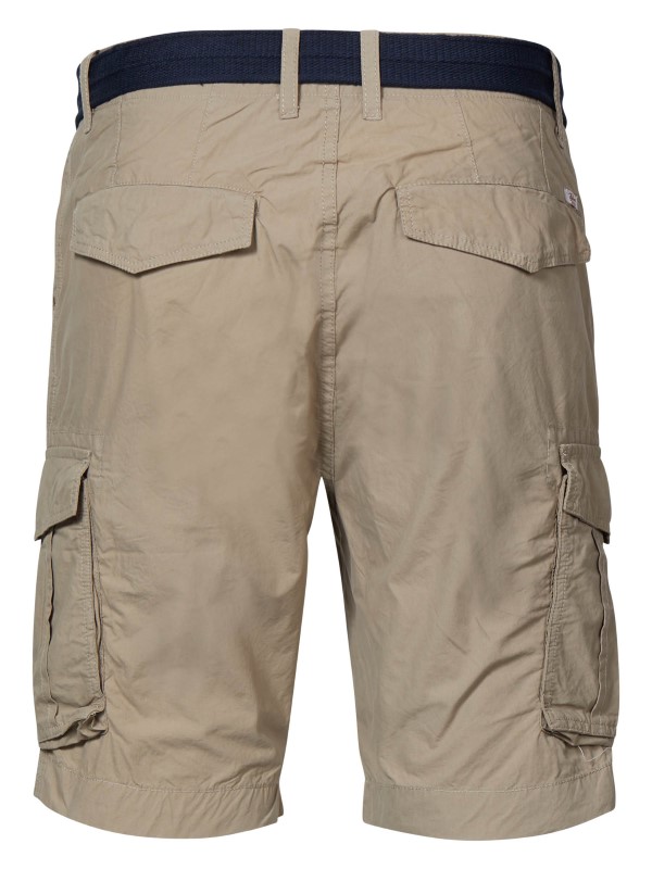 Cargo shorts with a matching belt, hook-and-eye closure, and a zip fly. These shorts have two slit pockets, two back flap pockets with press studs, and two cargo pockets with press studs. Made from 100% cotton and available in several colours.
