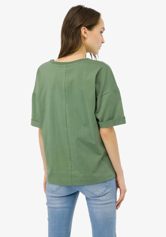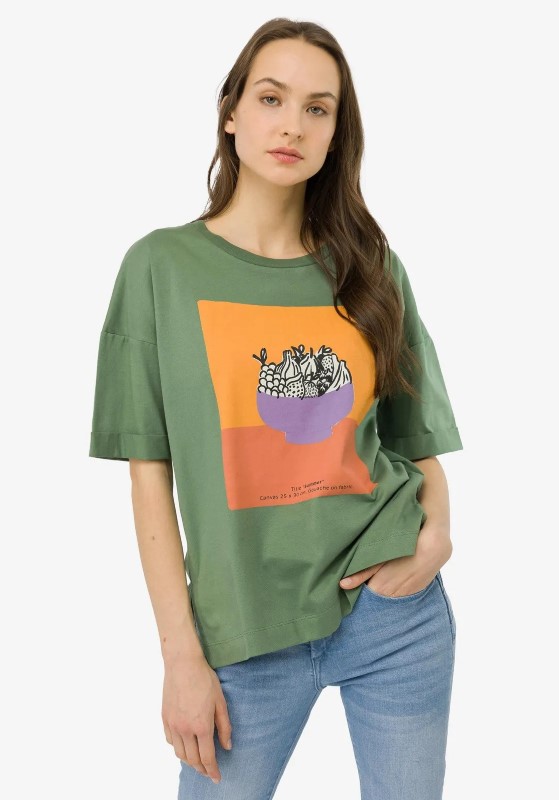 T-shirt με στρογγυλή λαιμόκοψη με κοντό μανίκι με πιέτες. Μπροστινή εκτύπωση. Κάτω με πλαϊνά ανοίγματα.