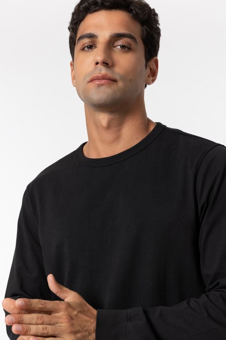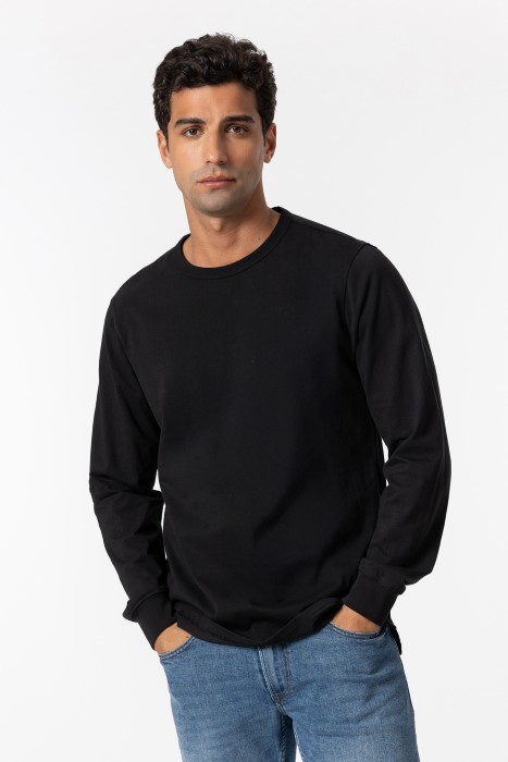 Long-sleeved T-shirt with ribbed cuffs and round neckline. Bottom with side slits.