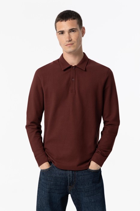 Polo shirt with tab collar and long sleeves with buttons. Front button fastening. Bottom with side openings.