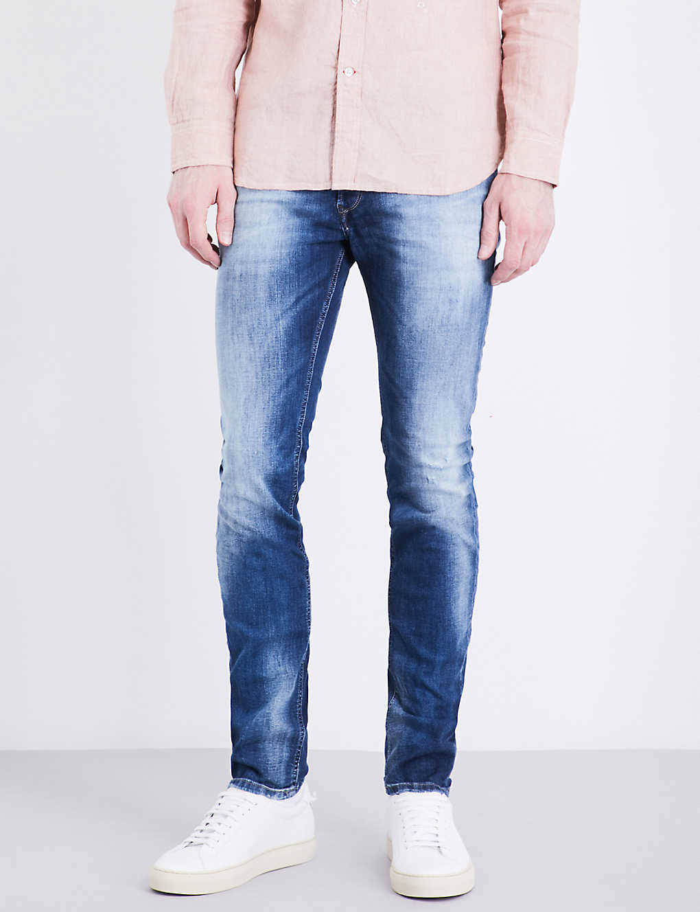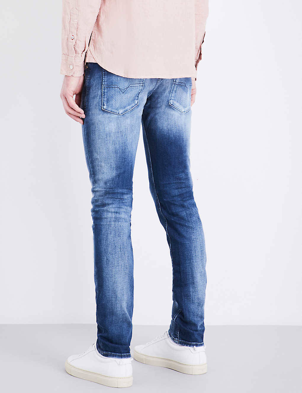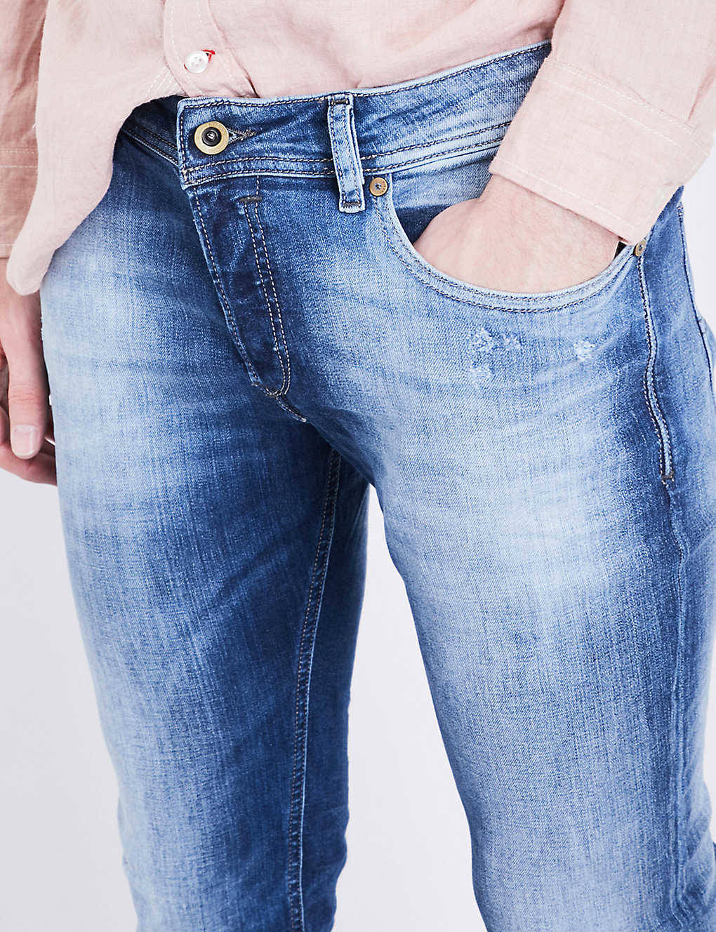 Slim-fit, skinny, tapered, mid-rise, faded wash and whiskering, belt loops, five pockets, branding at coin pocket and back waistband, distressed, branded hardware, v-shaped yoke at back